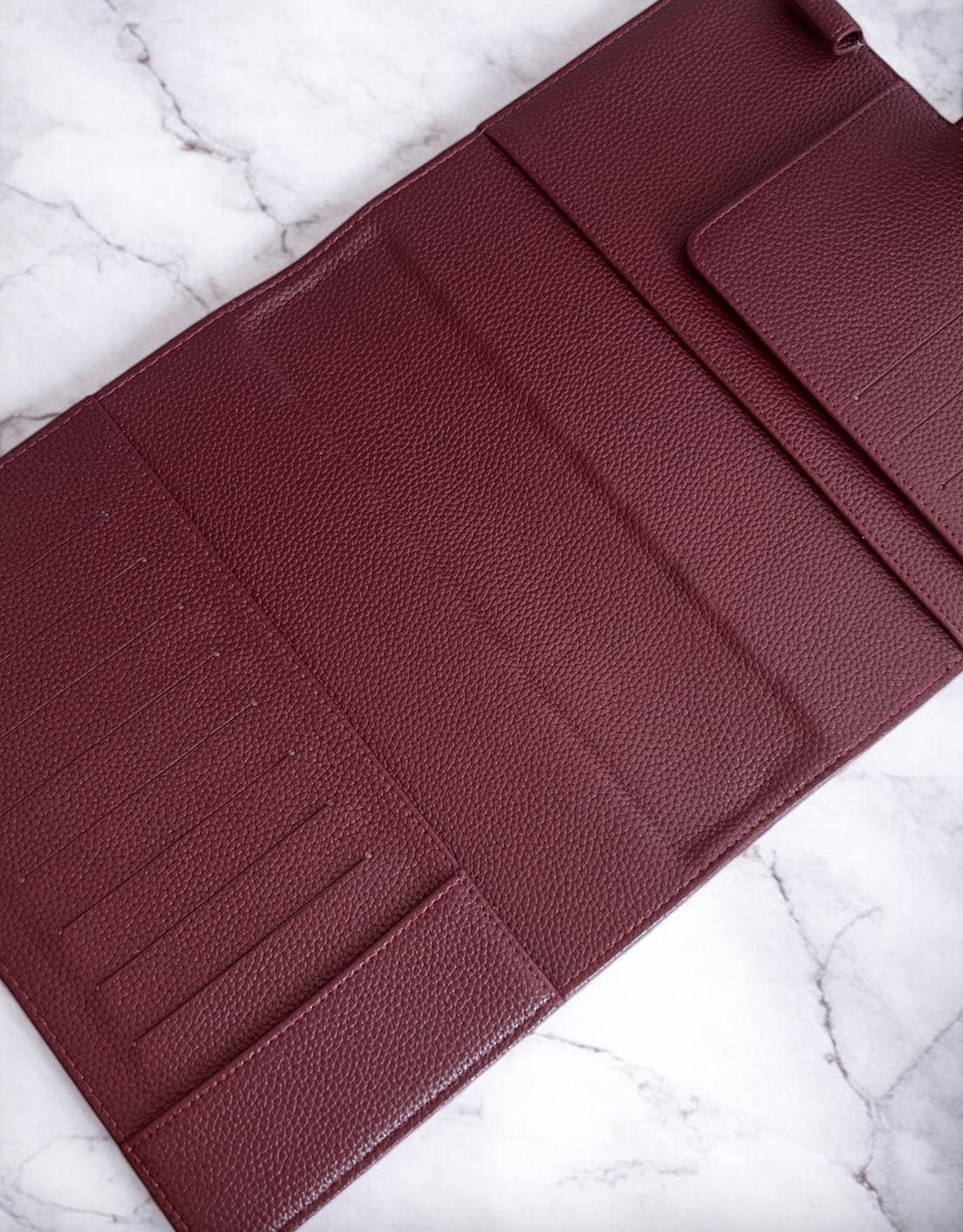 Rich berry hue with a luxe, grained vegan leather finish