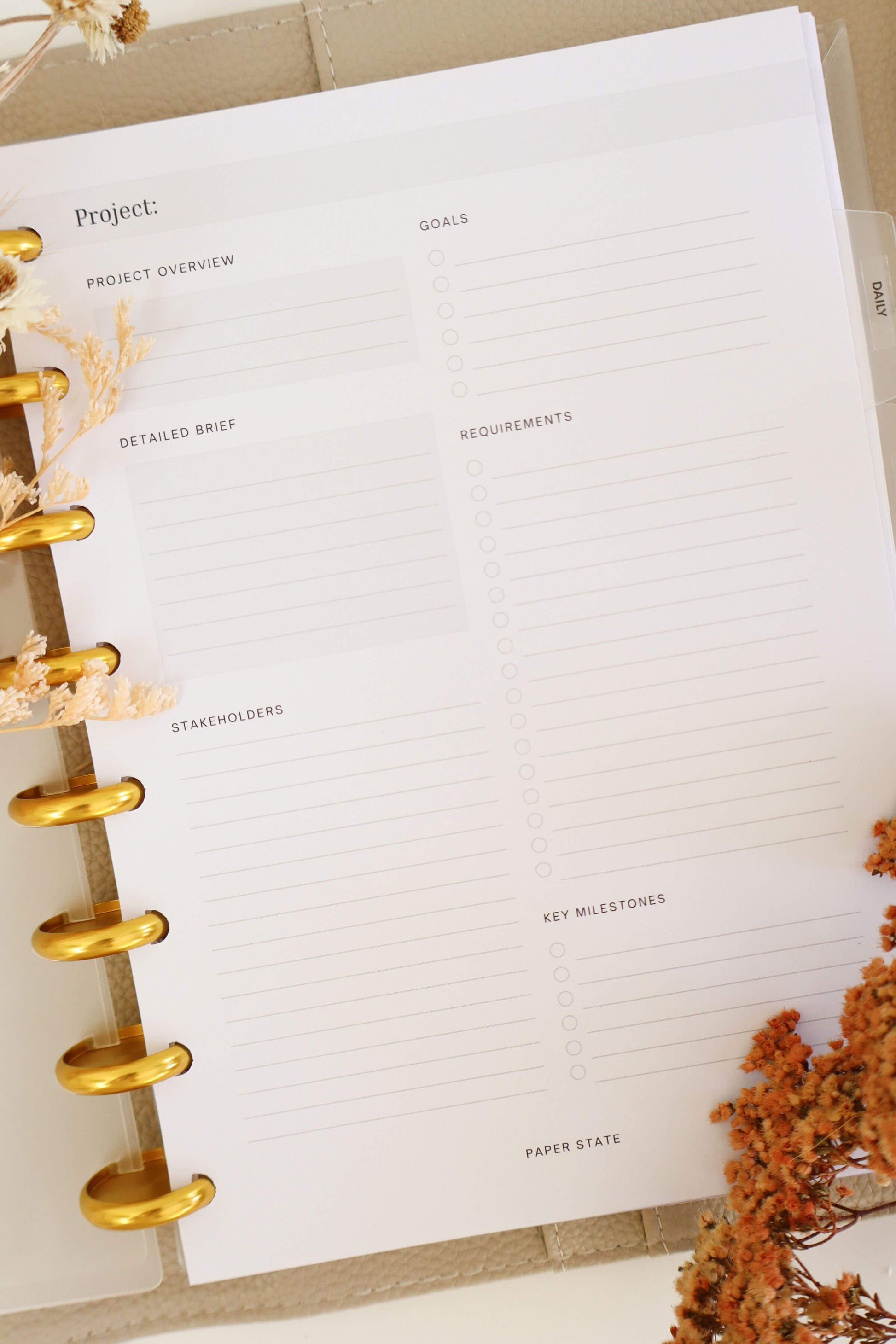 Each insert set includes 15 double-sided sheets (30 pages total), giving you room to manage multiple projects from concept to completion. The first page helps you capture your project overview, goals, requirements, key milestones, and stakeholders, while the reverse includes a full action plan table for assigning tasks, descriptions, and owners.
