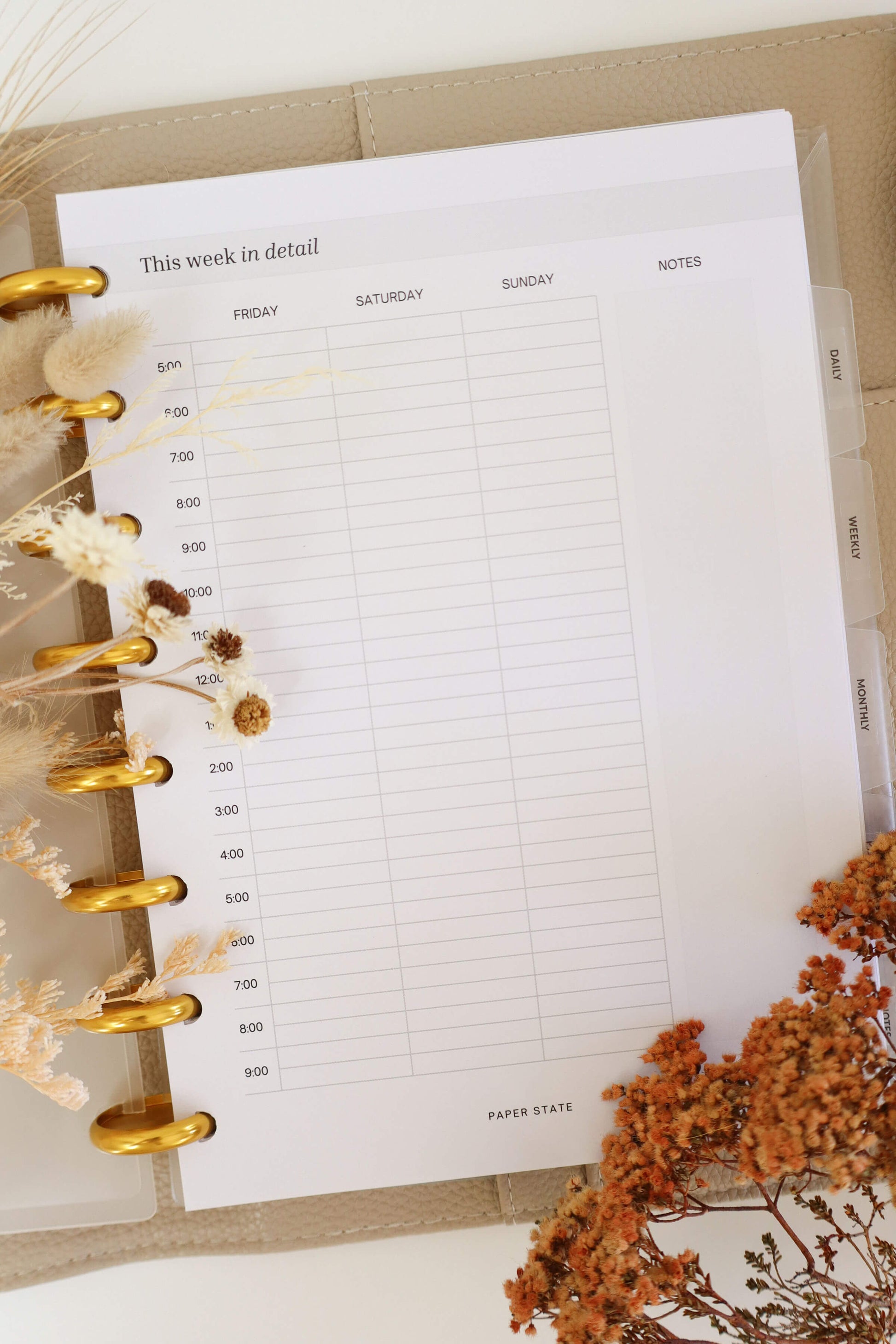 A detailed weekly schedule with time-blocking from morning to evening, giving you full visibility across your week.