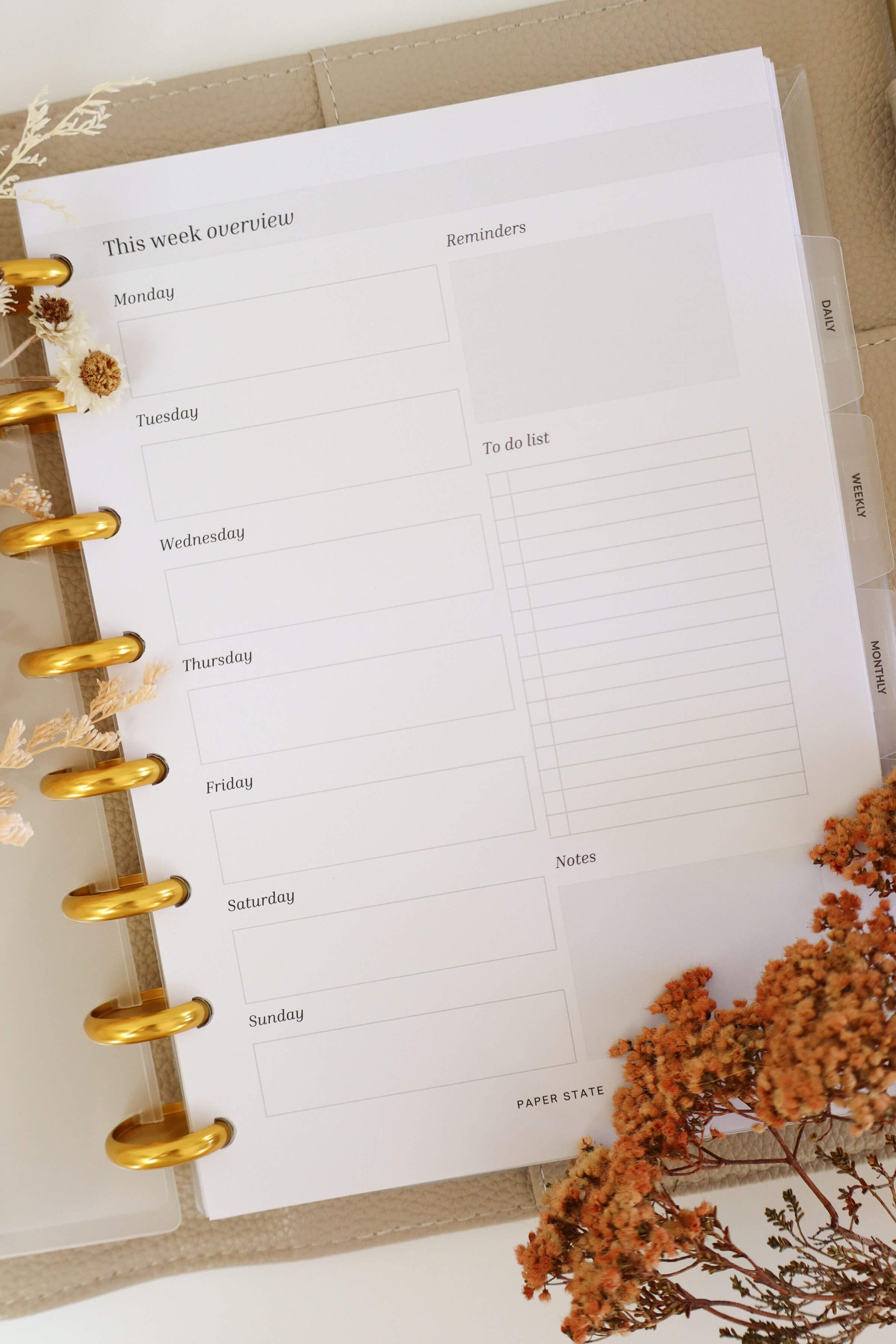 Plan your week with clarity and intention using our Weekly Overview Inserts — designed to help you manage priorities, appointments, and routines with ease.