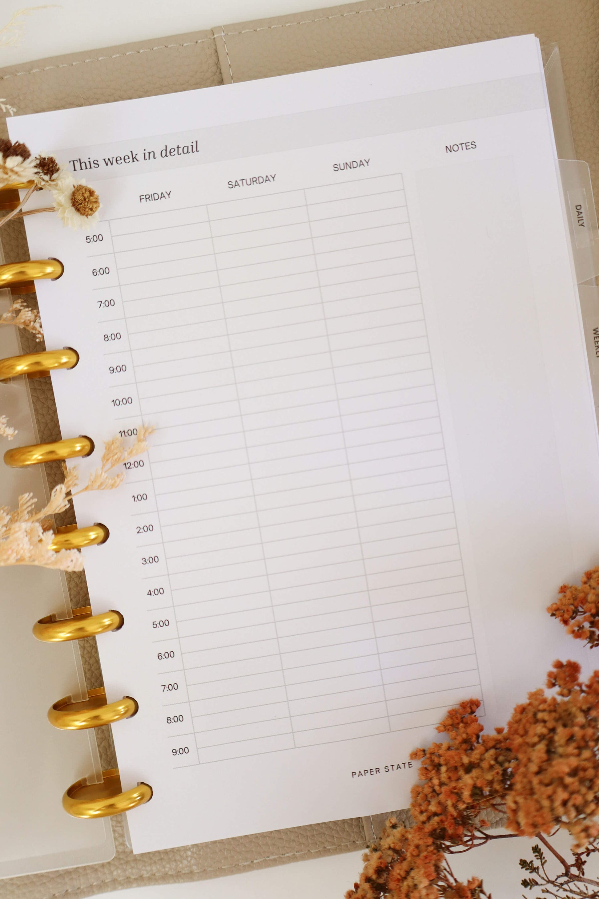 Each pack includes 8 weeks of undated inserts — 16 sheets total — with two pages for your weekly overview and two pages for your detailed schedule.