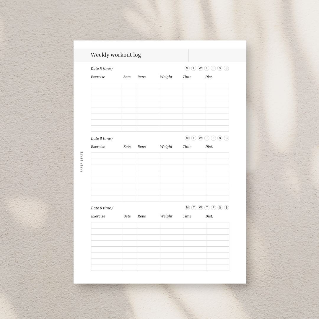 Keep track of your fitness journey with our A5 Workout Log Inserts. Designed to help you stay on top of your workouts, these inserts feature a practical layout with columns for Exercise, Sets, Reps, Weight, Time, and Distance, ensuring you have all the key information at your fingertips.